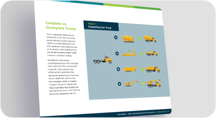 Complete vs. Figure 1 Completing the Truck Incomplete Trucks This is a significant distinction for + = commercial trucks. This one factor causes commercial auto insurance carriers to underestimate the true OCN, leading to lower premiums and an incomplete understanding of the risk for the insurance carrier—what + = is known as premium leakage. Incomplete trucks require customization before the can begin their useful life. This customization is specific to the unique needs + = of the business and reflect the specialized applications of the truck, such as within the construction, food transport, utilit, or medical transport industries. Importantl, + = these customized truck bodies can add significant alue to the OCN and will not be captured b the IN. Price Digests • Reducing Commercial Auto Risk Exposure • pricedigests.com • 4