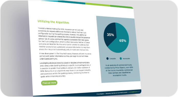 Utilizing the Algorithm To avoid underestimating the OCN, insurance carriers can and sometimes do request additional information about the final truck 35% configuration during the quoting process. However, this additional information request can extend the time to quote and put the potential sale at risk. t is also common for agents to populate their best guess 65% for the truck configuration, which is often inaccurate. Neither of these scenarios are ideal for the insurance carrier and do not address their need for access to fast, automated, accurate information to help them assess the risk, price it accordingl, and ultimatel win the business. new development in the insurtech space, however, will arm insurance carriers with better information so the can begin to correct those understated premiums. Complete Incomplete everaging advanced analtics based on decades of realworld data and a deep understanding of industrspecific truck configurations, it In an analysis of commercial trucks is possible to predict final buildouts and get a far better estimate of conducted by Price Digests oer OCN. oing this in an algorithmic wa means it can happen instantl of te trucks insured by commercial and seamlessl within the quoting process, minimi ing the time to lines carriers are classified as quote while enhancing accurac. incomplete trucks. Find out more Price Digests • Reducing Commercial Auto Risk Exposure • pricedigests.com • 7