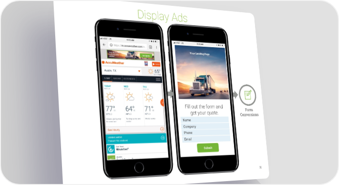 Display Ads Your Landing Page Your display ad Get Quote featuring your product Fill out the form and Form get your quote. Conversions Name Company Phone Email Submit 31