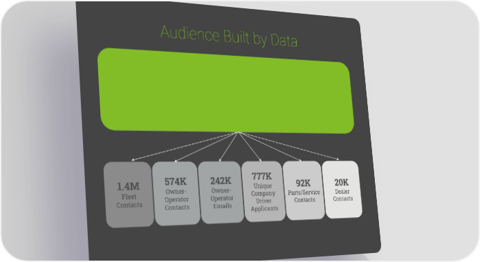 Audience Built by Data 1.4M 574K 242K 777K 92K 20K Owner- Owner- Unique Fleet Operator Operator Company Parts/Service Dealer Contacts Contacts Emails Driver Contacts Contacts Applicants