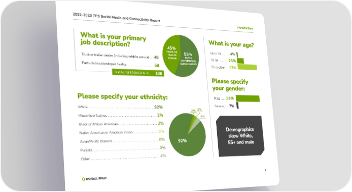 2022-2023 TPS Social Media and Connectivity Report Introduction What is your primary What is your age? job description? 45% Up to 34 .......4% TRUCK OR 55% TRAILER PARTS Truck or trailer dealer (including vehicle service) ... 48 DEALER DISTRIBUTION/ 35-54 ........25% Parts distribution/repair facility ..................... 58 REPAIR FACILITY 55 or older ...72% TOTAL RESPONDENTS �����106 Please specify your gender: Please specify your ethnicity: Male �����93% White �������������������������������������������92% Female ����7% 2% 2% Hispanic or Latino ���������������������������������2% 4% Black or African American ��������������������������2% Native American or American Indian ����������������0% Demographics Asian/Pacific Islander ������������������������������0% 92% skew White, Punjabi �������������������������������������������0% 55+ and male Other ��������������������������������������������4% 4