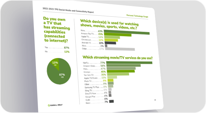 2022-2023 TPS Social Media and Connectivity Report Personal Technology Usage Do you own Which device(s) is used for watching a TV that shows, movies, sports, videos, etc.? has streaming Roku �������������������43% capabilities Amazon Fire TV ������25% (connected Apple TV ��������������14% to internet)? Chromecast �����������12% Android TV �����������10% Xbox ���������������������2% Yes .................87% Other ������������������27% No ..................13% Which streaming movie/TV services do you use? 13% Netflix �����������������77% NO Amazon Video ��������56% Hulu �������������������47% 87% Disney+ ���������������45% YouTube TV �����������35% YES Apple TV/iTunes �����15% Pluto TV ����������������9% Other ��������������������9% Samsung TV Plus ������8% Sling TV �����������������5% DirecTV Now �����������4% Google Play ������������4% Quibi ��������������������0% None ��������������������7% 13