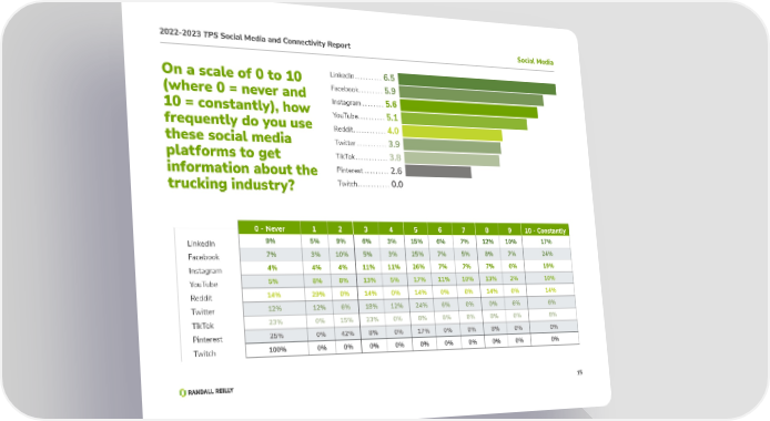 2022-2023 TPS Social Media and Connectivity Report Social Media On a scale of 0 to 10 LinkedIn ����������6.5 (where 0 = never and Facebook ���������5.9 10 = constantly), how Instagram ��������5.6 frequently do you use YouTube ����������5.1 Reddit ������������4.0 these social media Twitter �����������3.9 platforms to get TikTok ������������3.8 information about the Pinterest ���������2.6 trucking industry? Twitch ������������0.0 0 - Never 1 2 3 4 5 6 7 8 9 10 - Constantly LinkedIn 9% 5% 9% 6% 3% 15% 6% 7% 12% 10% 17% Facebook 7% 3% 10% 5% 3% 25% 7% 5% 8% 7% 24% Instagram 4% 4% 4% 11% 11% 26% 7% 7% 7% 0% 19% YouTube 5% 8% 8% 13% 5% 17% 11% 10% 13% 2% 10% Reddit 14% 29% 0% 14% 0% 14% 0% 0% 14% 0% 14% Twitter 12% 12% 6% 18% 12% 24% 6% 0% 0% 6% 6% TikTok 23% 0% 15% 23% 0% 8% 8% 8% 8% 0% 8% Pinterest 25% 0% 42% 8% 0% 17% 0% 0% 8% 0% 0% Twitch 100% 0% 0% 0% 0% 0% 0% 0% 0% 0% 0% 15
