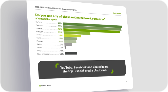 2022-2023 TPS Social Media and Connectivity Report Social Media Do you use any of these online network resources? (Check all that apply) YouTube ��������������������������59% Facebook �������������������������58% LinkedIn ��������������������������56% Instagram ������������������������25% Twitter ���������������������������16% TikTok ����������������������������12% Pinterest �������������������������11% Reddit ������������������������������7% Twitch ������������������������������1% Other �������������������������������0% None of the above ���������������11% YouTube, Facebook and LinkedIn are the top 3 social media platforms. 14